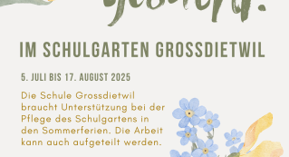 Um das Giessen und weitere Gartenarbeiten über die Sommerferien zu regeln, wurde im Vorfeld ein Aufruf beim Seniorentreff gestartet. Die Schule Grossdietwil erhoffte sich von interessierten Rentnerinnen und Rentnern Unterstützung. Glücklicherweise stellte sich eine Anwohnerin zur Verfügung, die Pflege des Schulgartens während der Sommerferien zu übernehmen. Dafür danken wir herzlich!